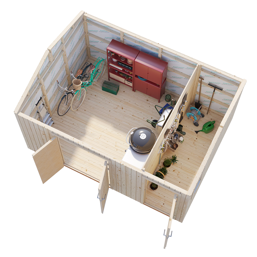 Olaf har dobbelporter som gjør det smidig å trille inn og ut sykler i boden. Boddørene er enkle og uisolerte med med trepanel og treramme.