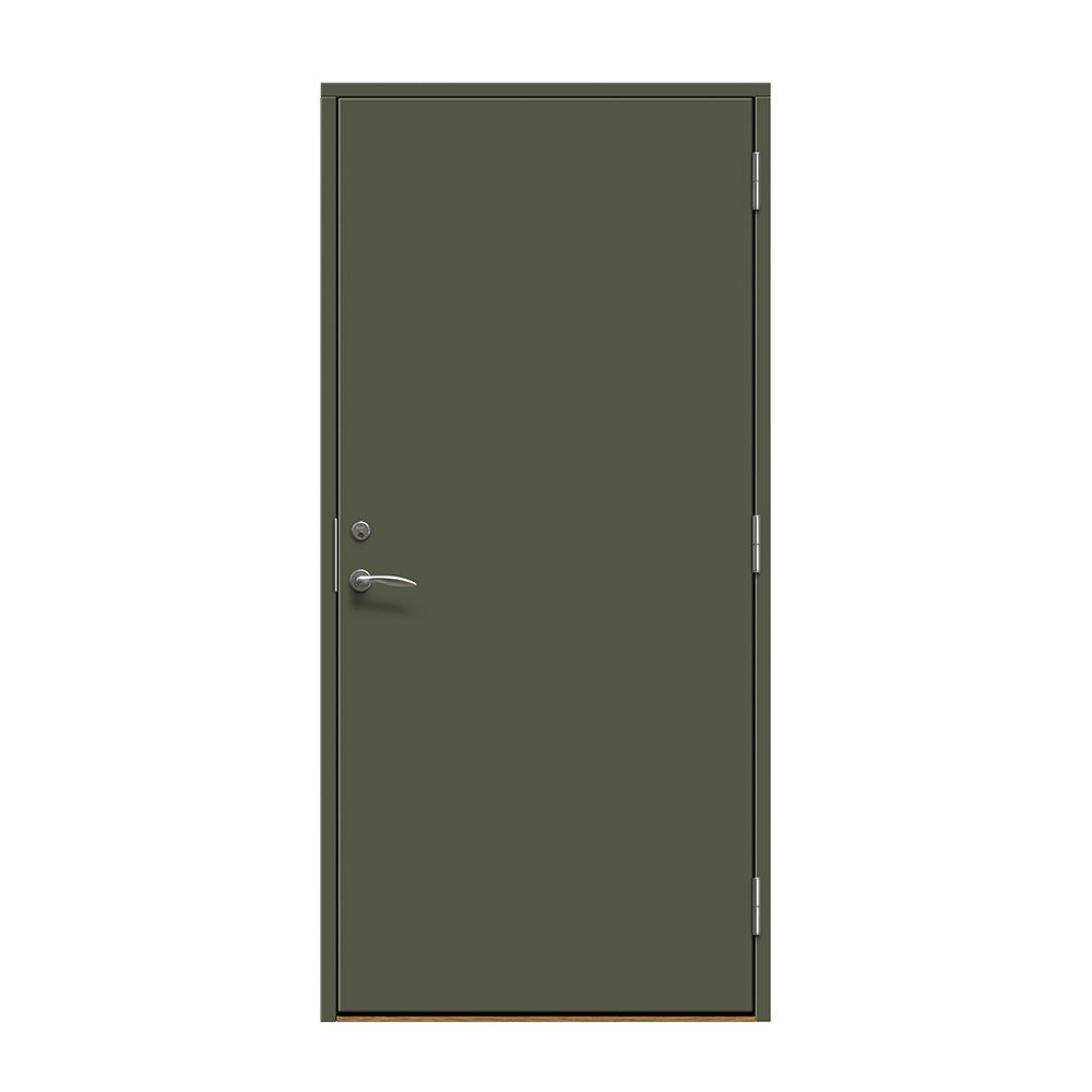 Døren fargelegges med hjelp av en vannbasert malingsteknikk. Vi anbefaler ikke å male over inngangsdøren på nytt, fordi glasslist og dør er i forskjellige materialer og kan reagere forskjellig på fargen som brukes. Vær oppmerksom på at en inngangsdør i mørk farge skal monteres beskyttet mot direkte sterkt sollys og høy varme for å unngå vridning og solbleking.