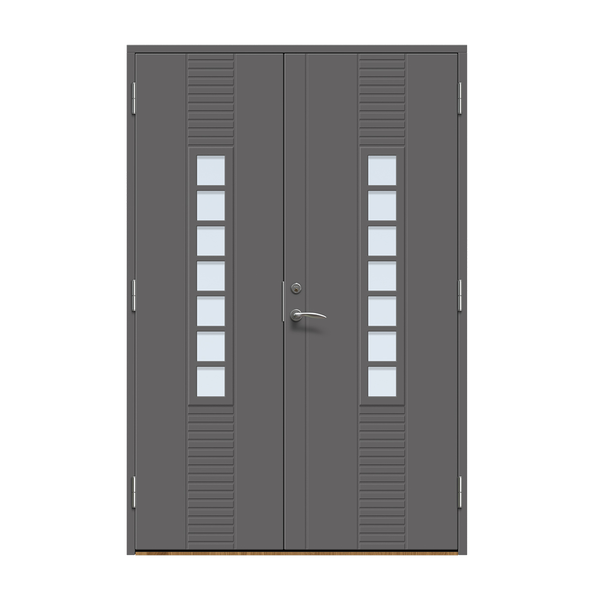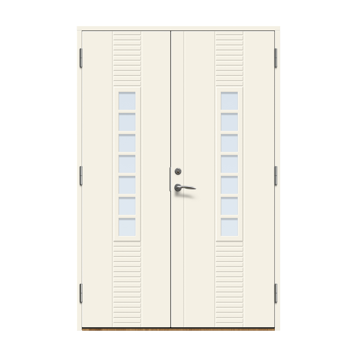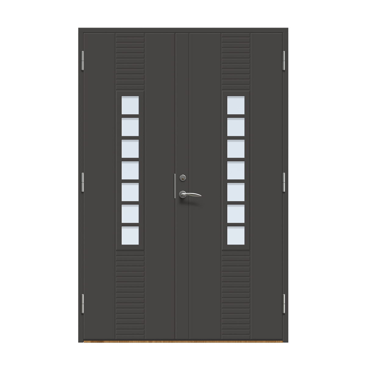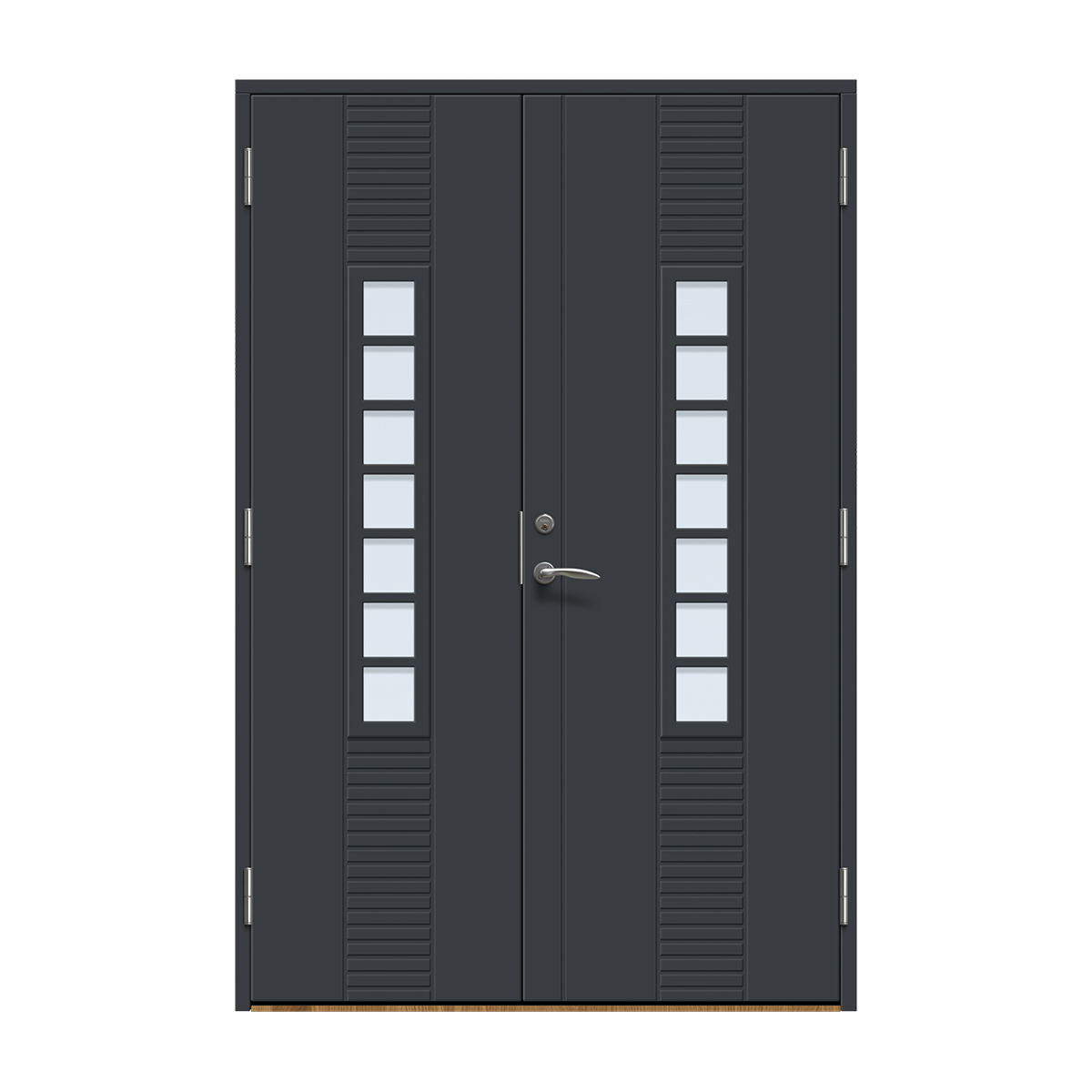 Mölle er en moderne og trendy pardør med små vinduer. Passer utmerket til nybygde hus. Døren har et sporfreste mønster på utsiden og glatt innside.
