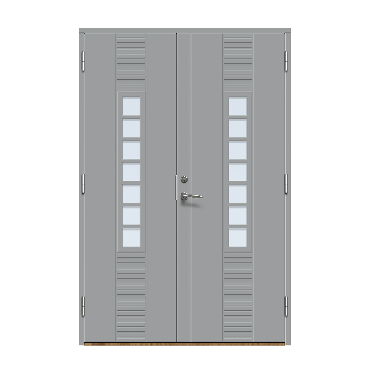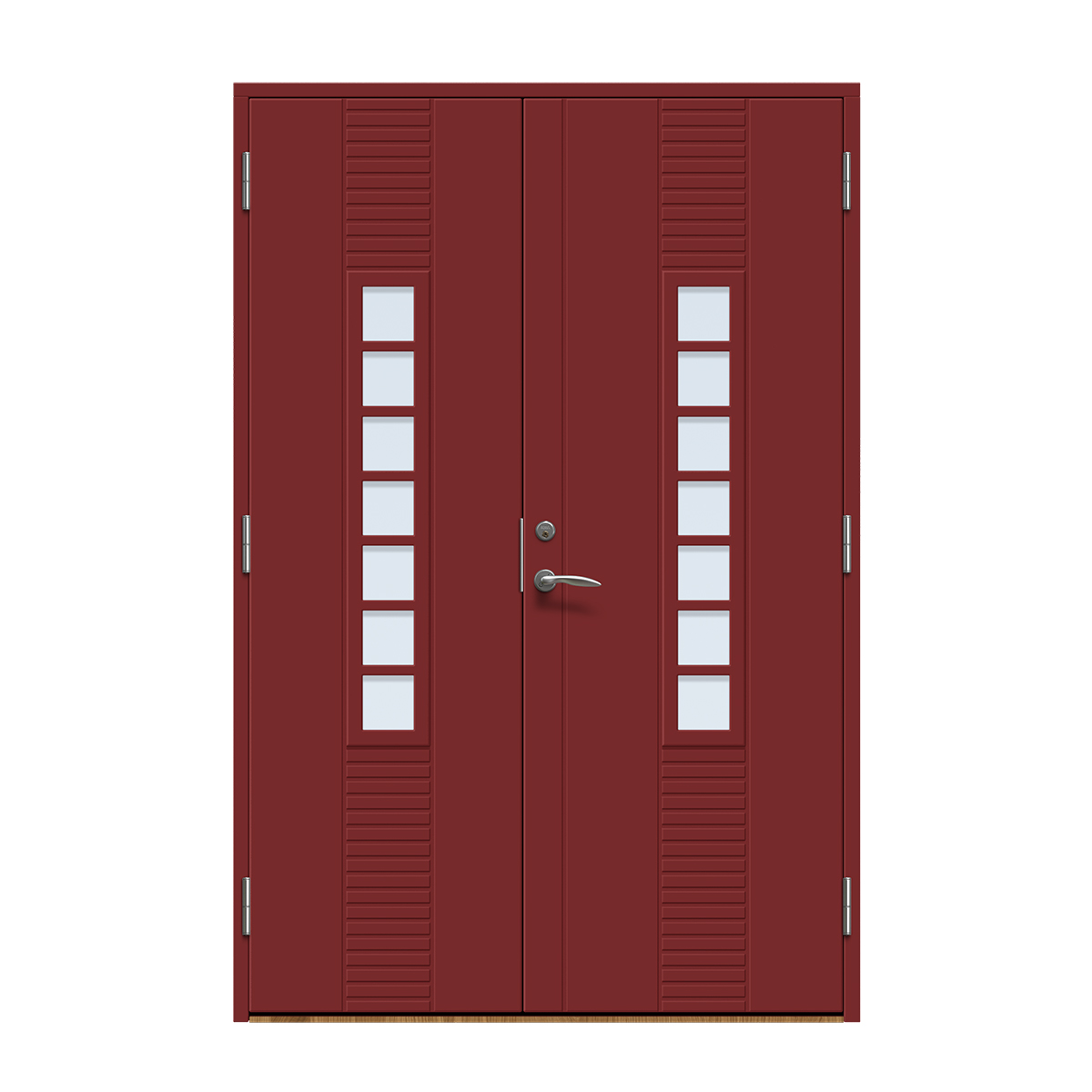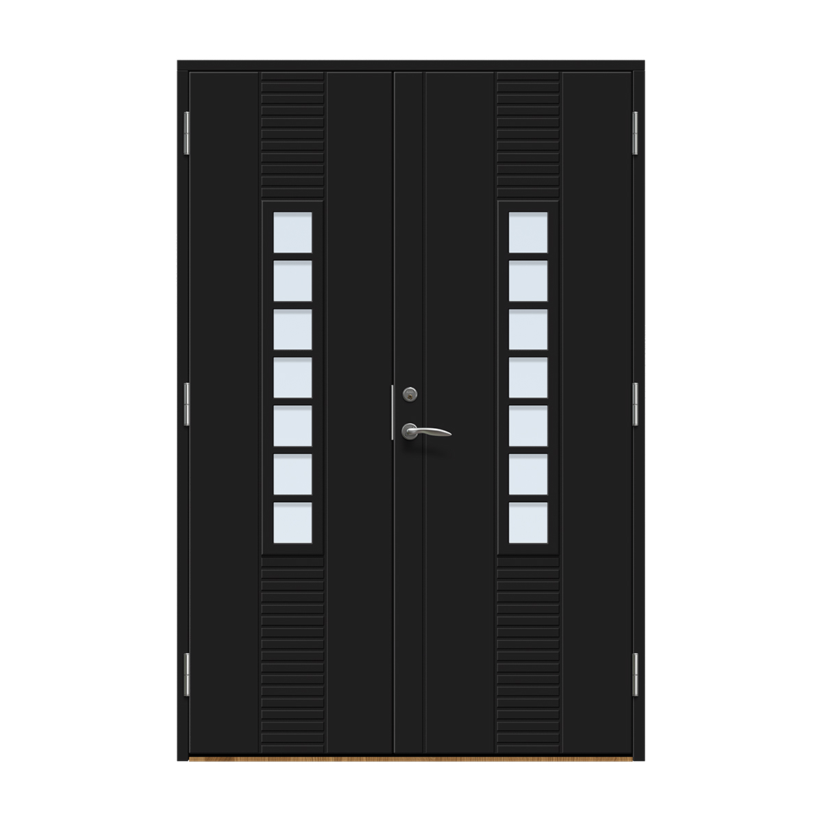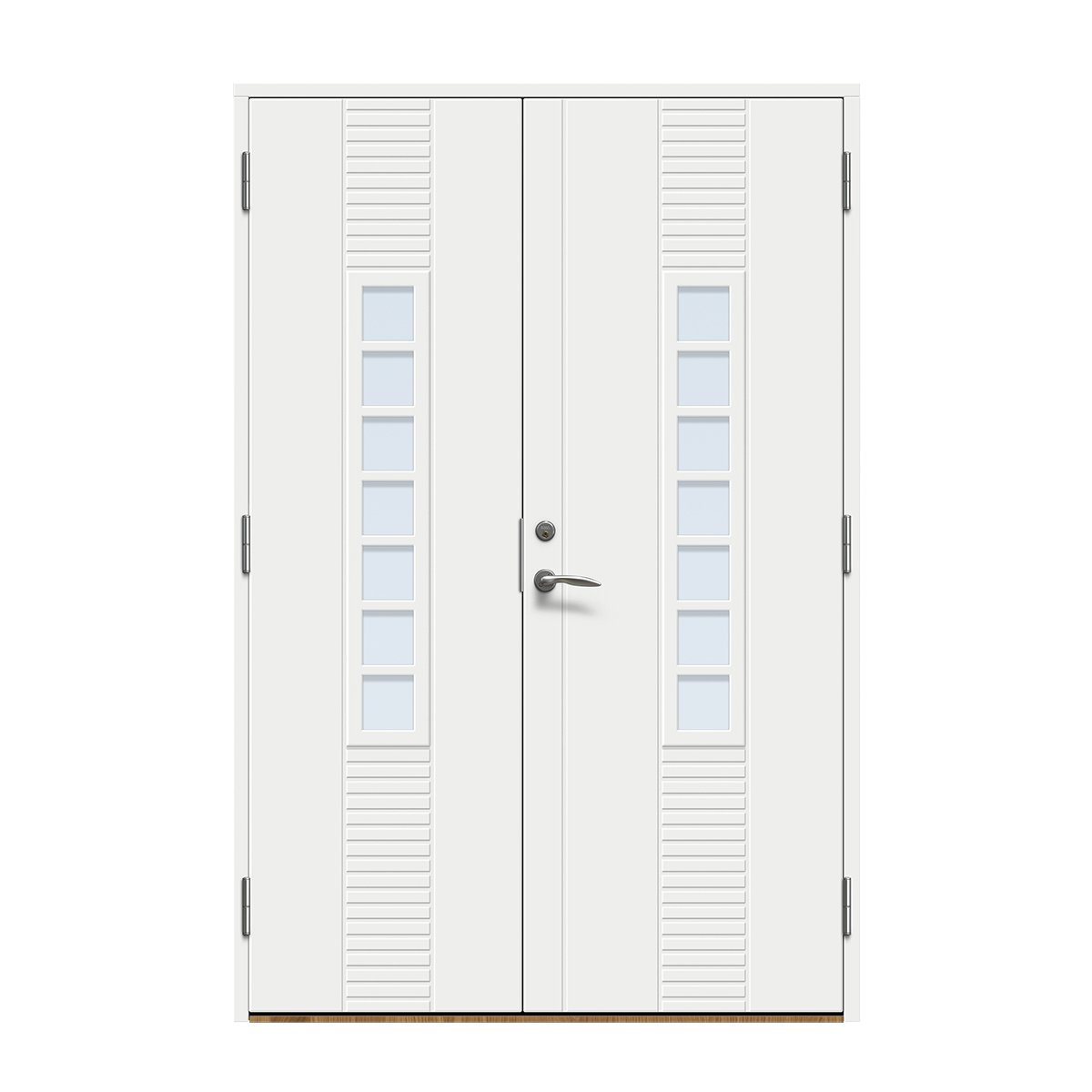 Mölle er en moderne og trendy pardør med små vinduer. Passer utmerket til nybygde hus. Døren har et sporfreste mønster på utsiden og glatt innside.