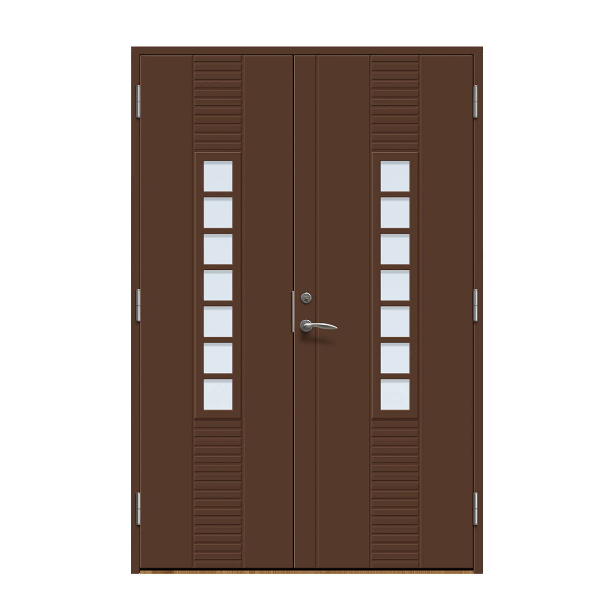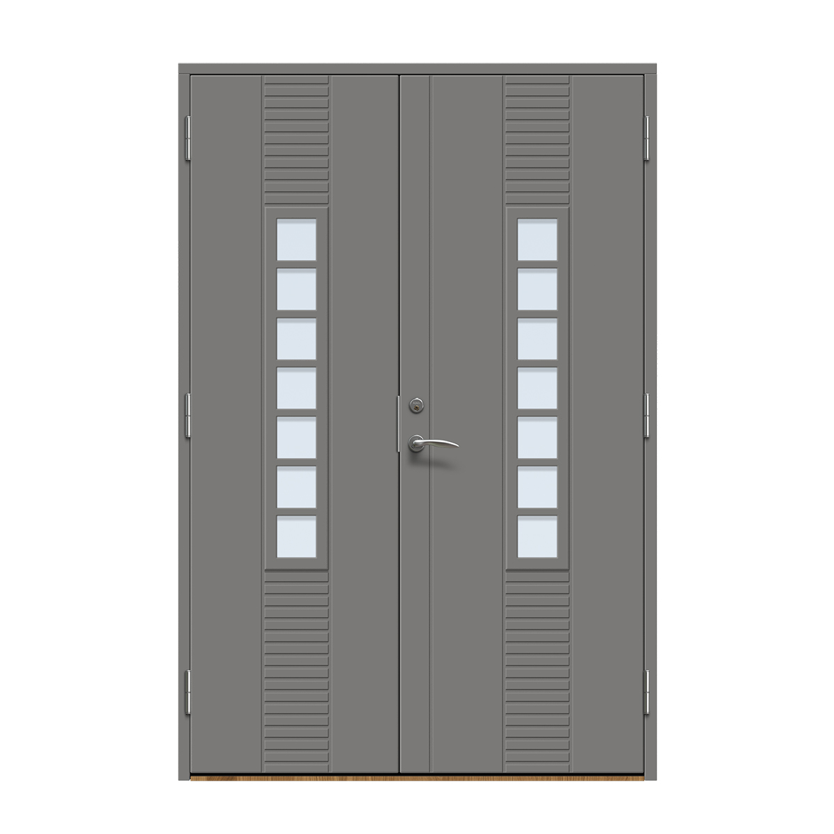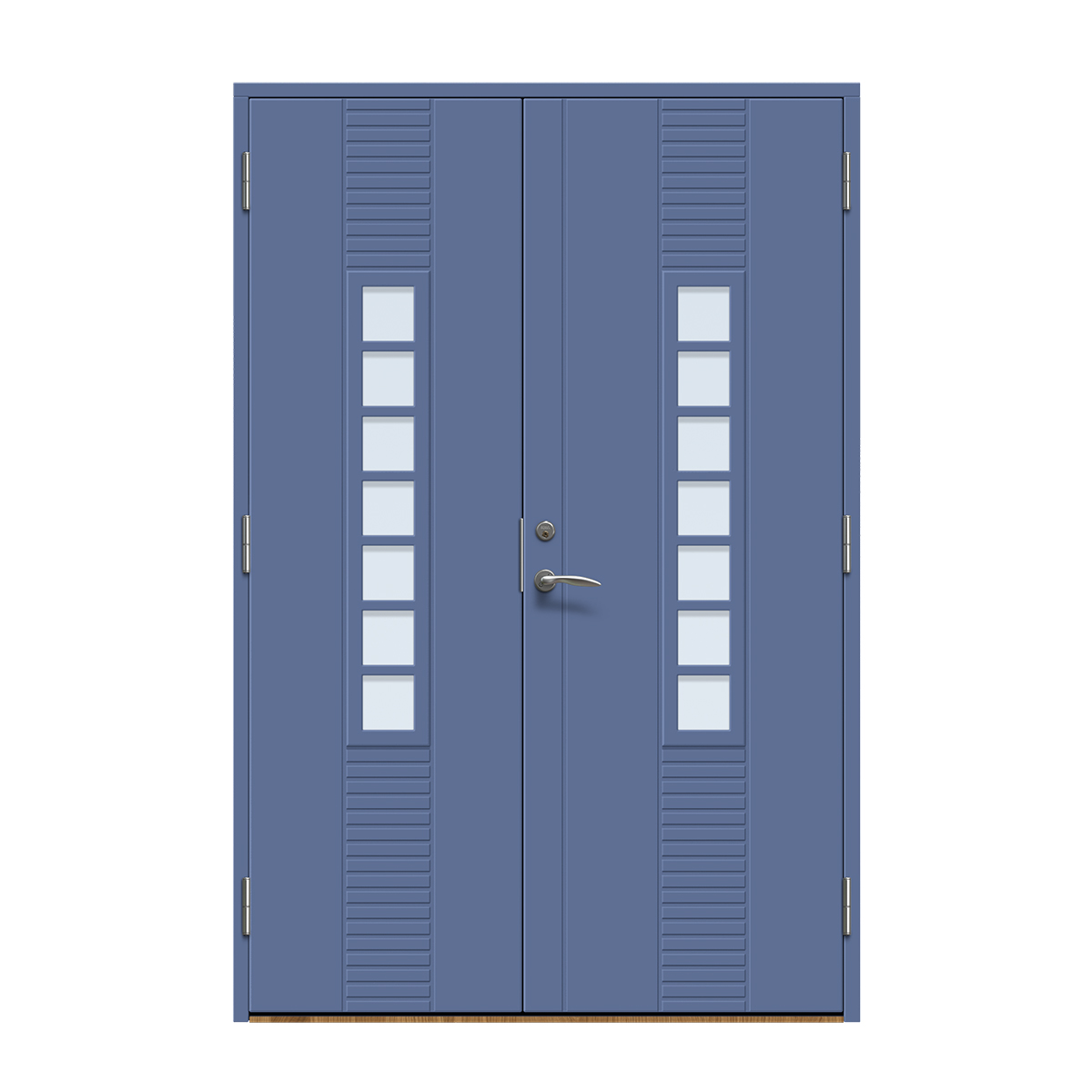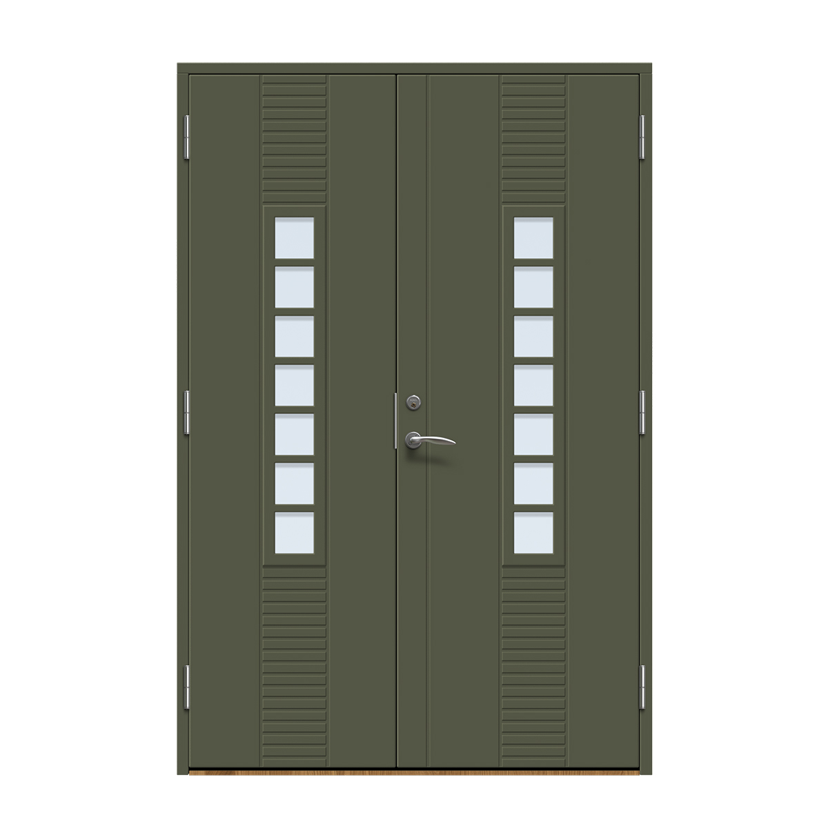 Mölle er en moderne og trendy pardør med små vinduer. Passer utmerket til nybygde hus. Døren har et sporfreste mønster på utsiden og glatt innside.