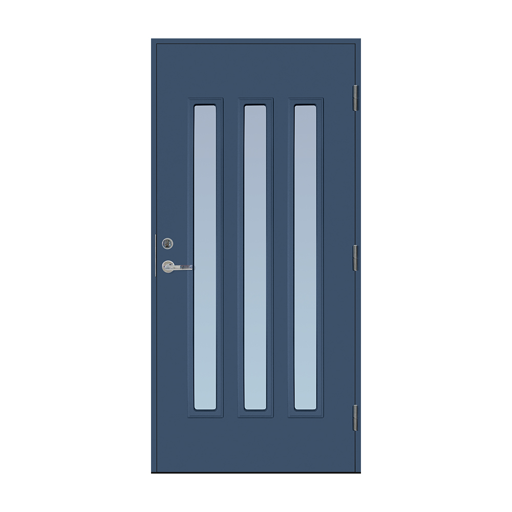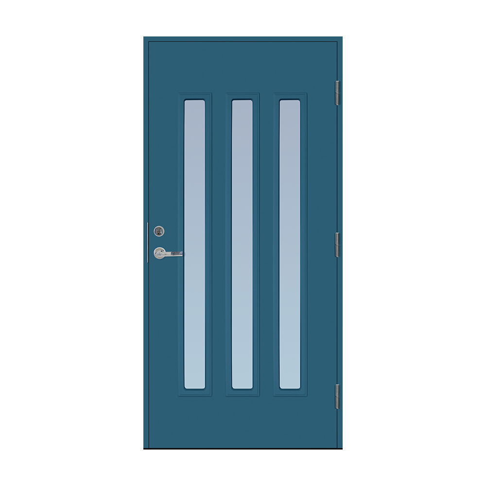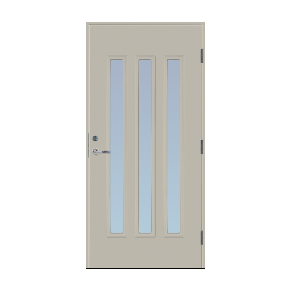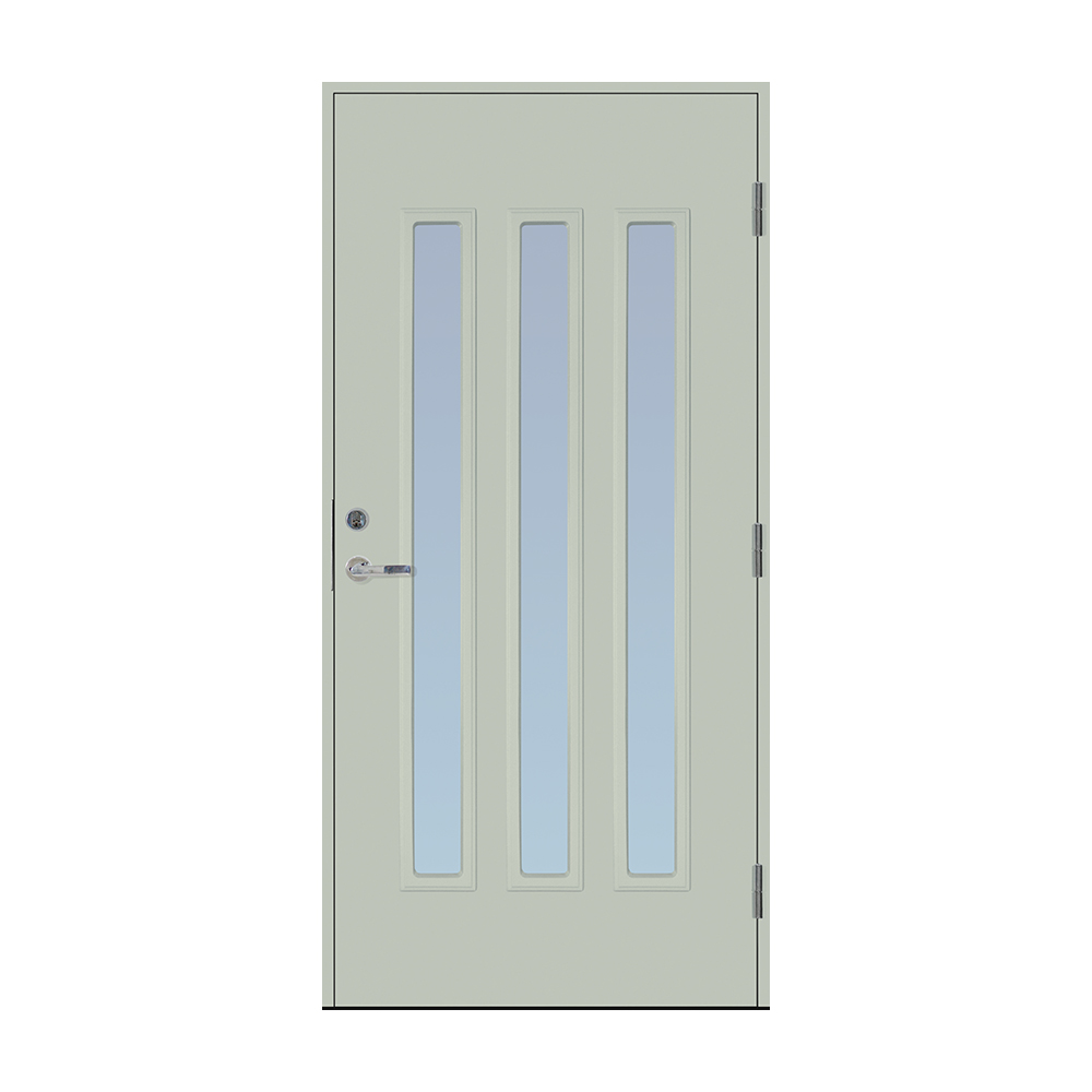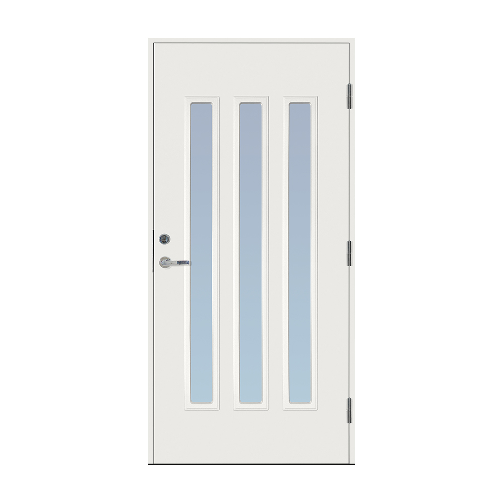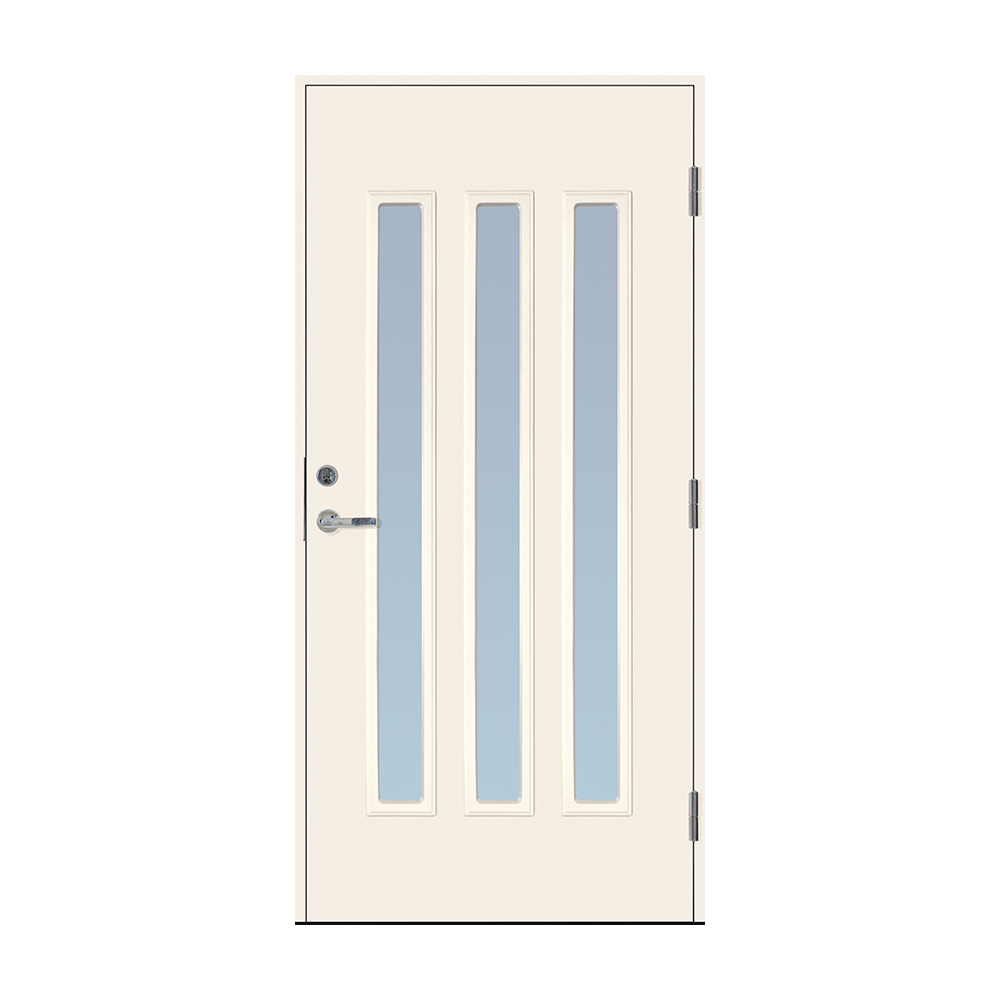 Dørbladet har en glatt innside, er 64 mm tykk og har 55 mm isolering, samt to aluminiumplater som beskytter den indre konstruksjonen.