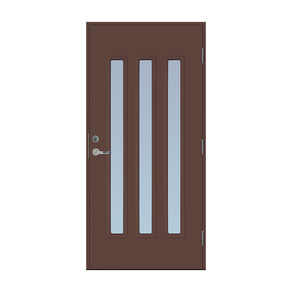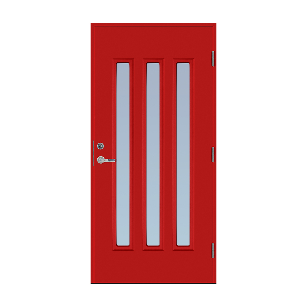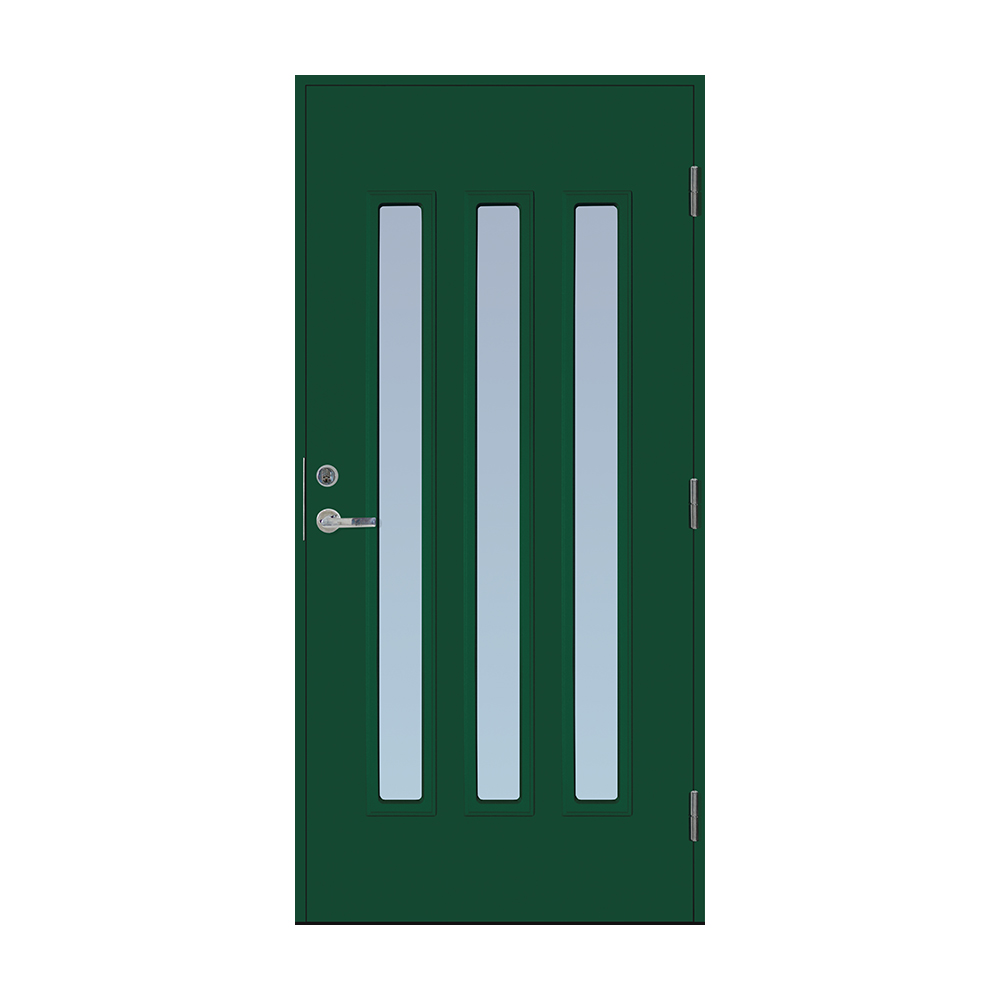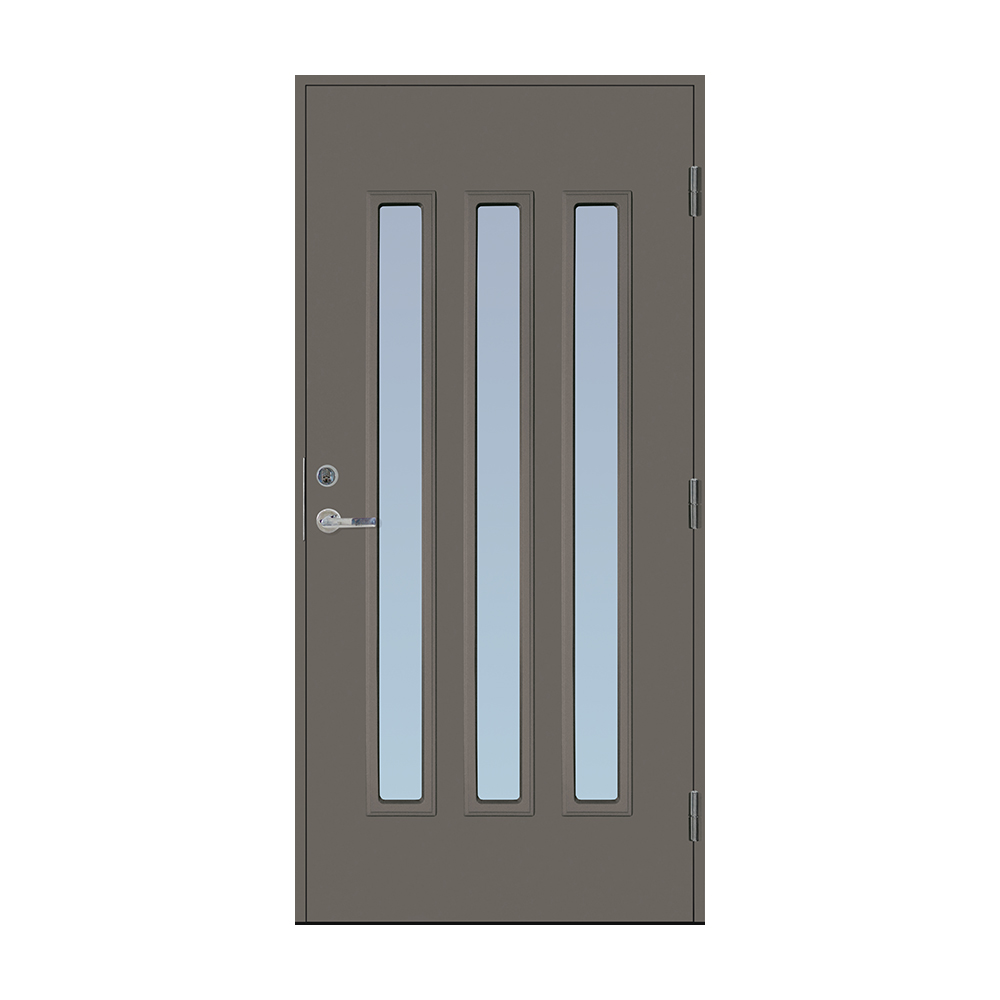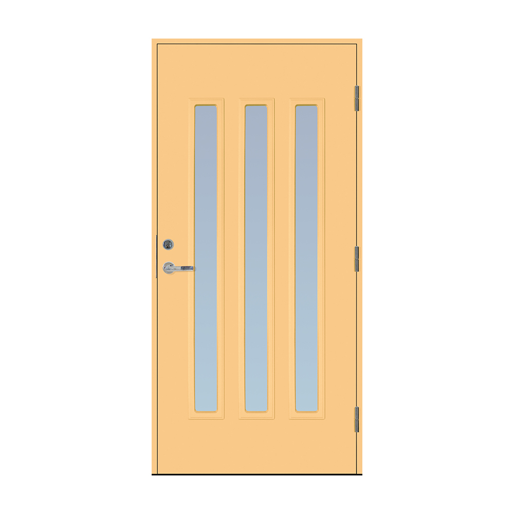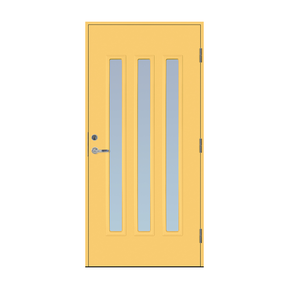 Dørbladet har en glatt innside, er 64 mm tykk og har 55 mm isolering, samt to aluminiumplater som beskytter den indre konstruksjonen.