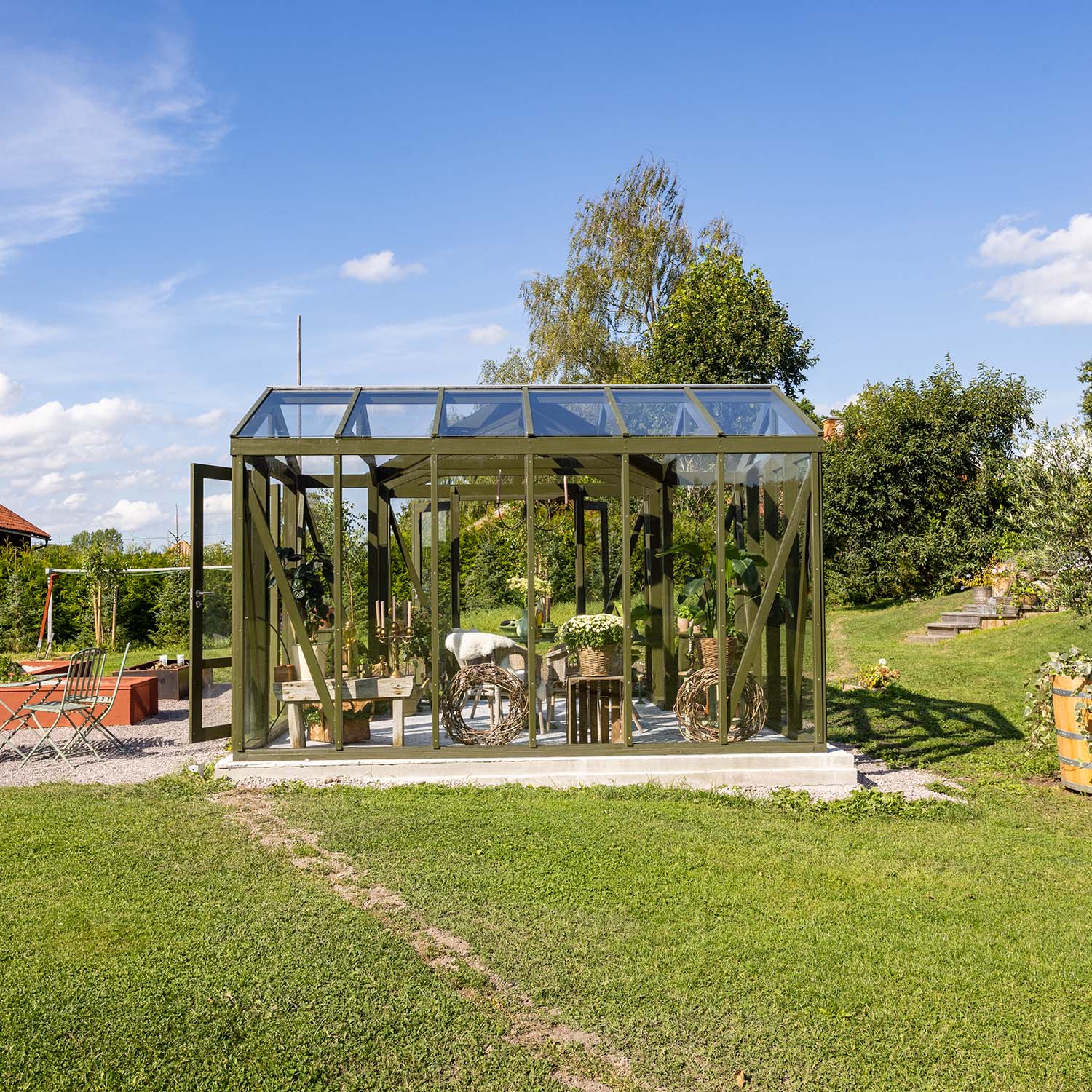 Opplev Linnea Orangeri - et storslått og romslig drivhus i klassisk T-form som forener tidløs design med maksimalt lysinnslipp. Den innbydende entréen skaper en velkommende atmosfære for både planter og besøkende.