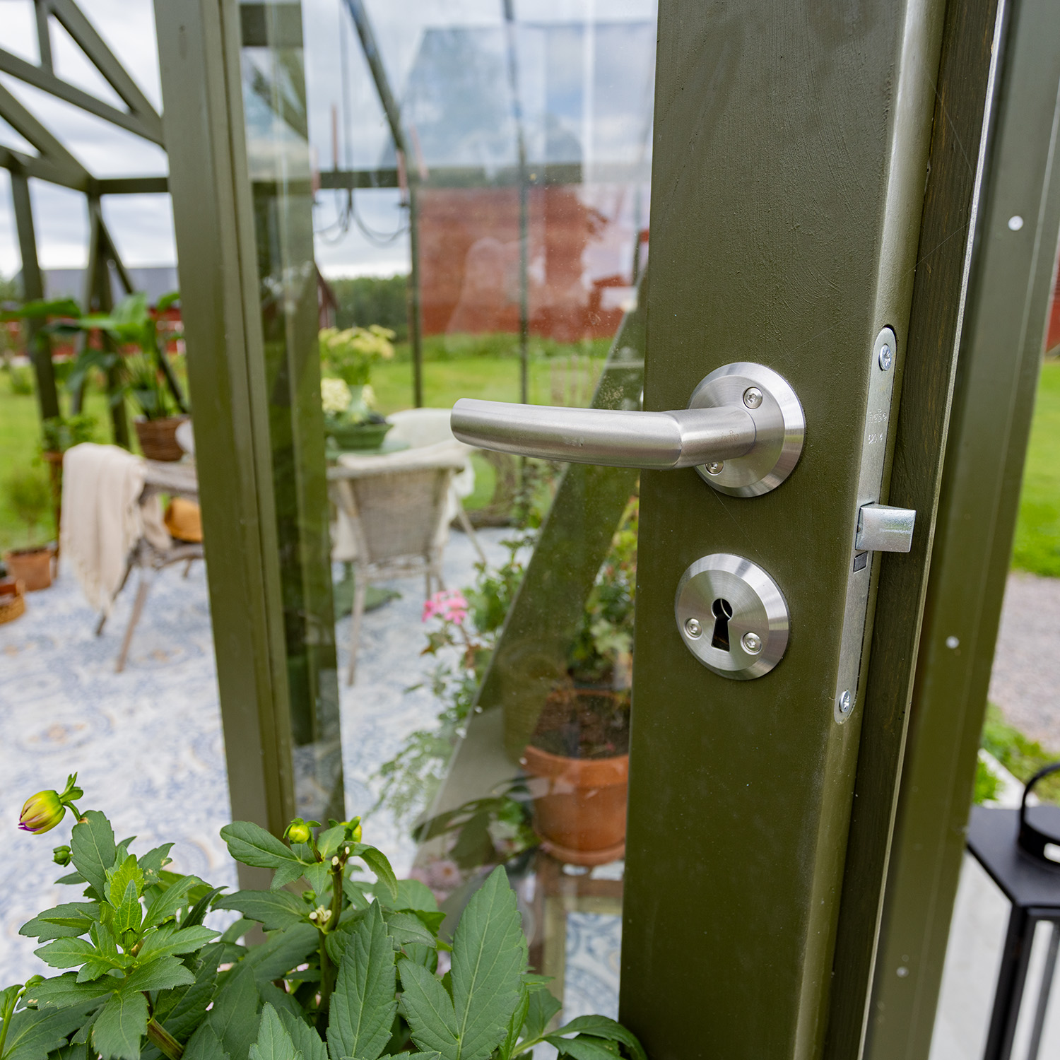 Med sitt slanke design står materialvalget virkelig i sentrum. Antall deler som ikke er laget av tre eller glass er minimalt, noe som skaper et vakkert helhetsinntrykk. Drivhusets robuste og doble dører gir et innbydende inntrykk, og gjør det enkelt for deg å kunne kjøre trillebår inn i drivhuset. Dørene er utstyrt med et låsbart håndtak.