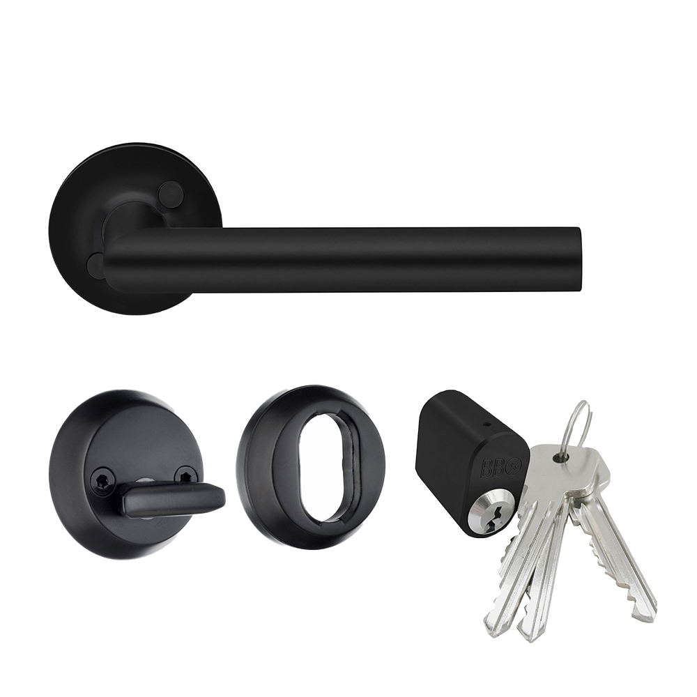 Det er ikke inkludert beslagspakke med dørhåndtak eller sylinder til denne døren, men det må kjøpes som tilvalg. Du kan velge fritt mellom beslagspakkene som tilbys, også kodelåsen Yale Doorman L3S passer.