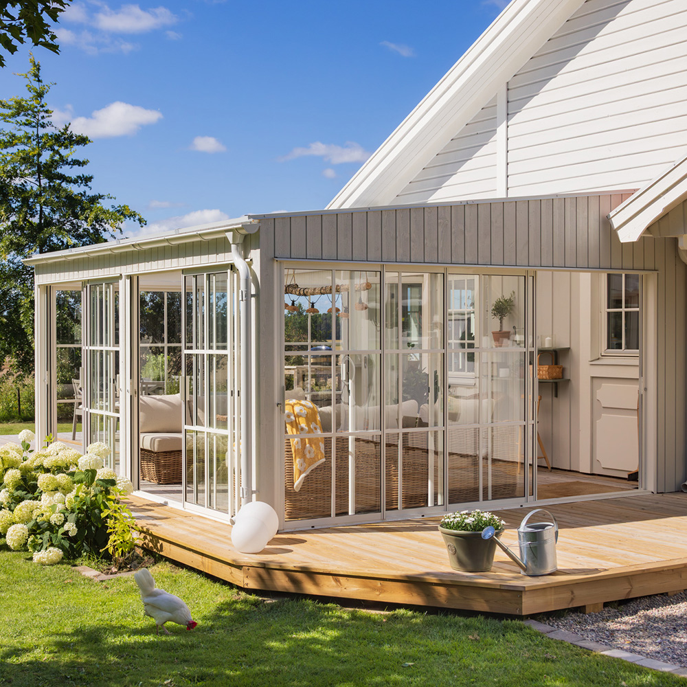 Med et design som er unikt på hagestuemarkedet, kan du skape noe helt spesielt med Forma. Ulike tilvalg og valgmuligheter gjør det enkelt å tilpasse hagestuen etter dine ønsker. Reisverket kan leveres ferdigmalt i hvitt, svart eller antrasittgrått. Velger du sprosser som tilvalg, leveres de i samme farge som skyvepartiene du har valgt.