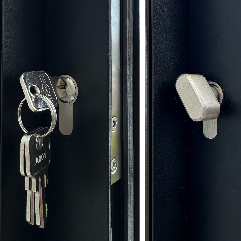 Flex tilbyr ulike utførelser for låsingen av partiet. Du kan velge å ha nøkkel både på innsiden og utsiden (for økt sikkerhet). Alternativt velger du låsing med nøkkel på utsiden og vrider på innsiden (enkelt og praktisk).