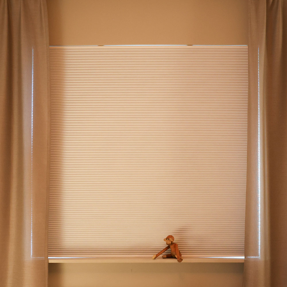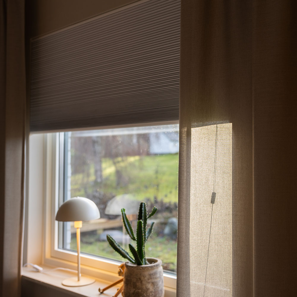 Vær oppmerksom på at miljøbildene viser en topphengt gardin. Uavhengig av oppheng har begge variantene av plisségardinene samme utseende.