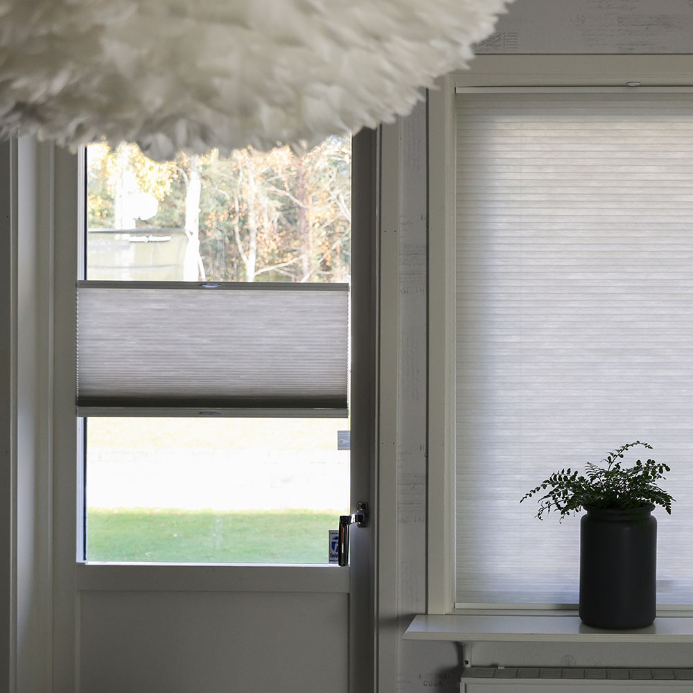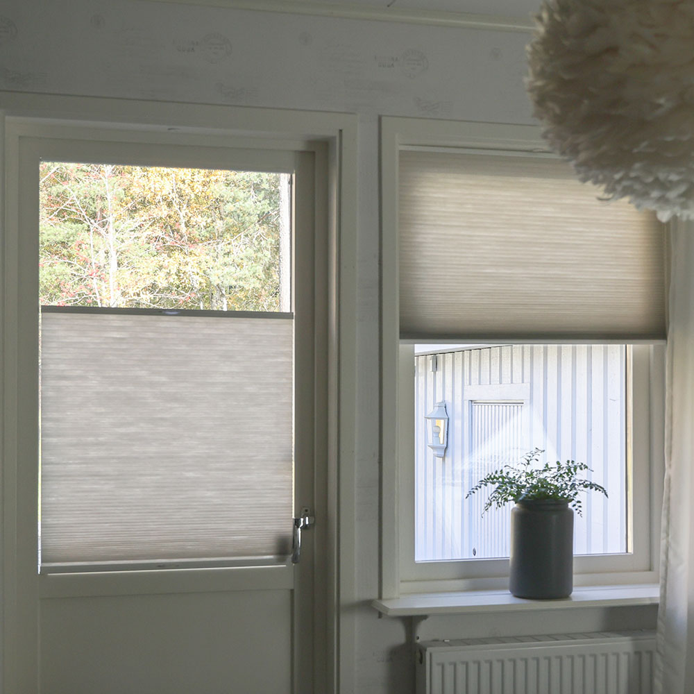 Miljøbildene viser en plisségardin i fargen lysegrå.