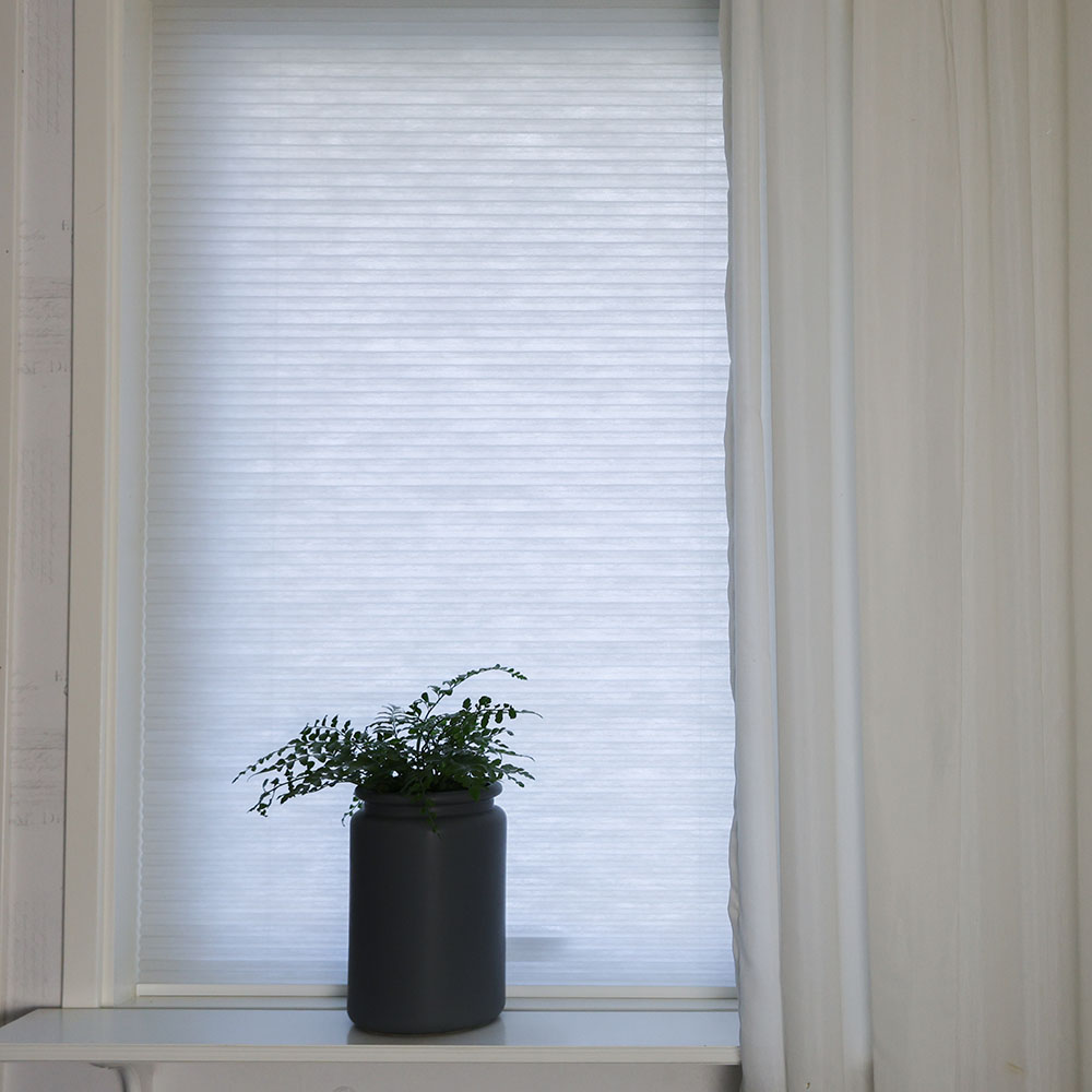 Plisségardinet består av aluminium bunn- og topplist, i tillegg til stoffet. Gardinet gir et behagelig inneklima. Om sommeren holdes varmen ute, og om vinteren reduseres varmetapet ved vinduet med ca. 46%.