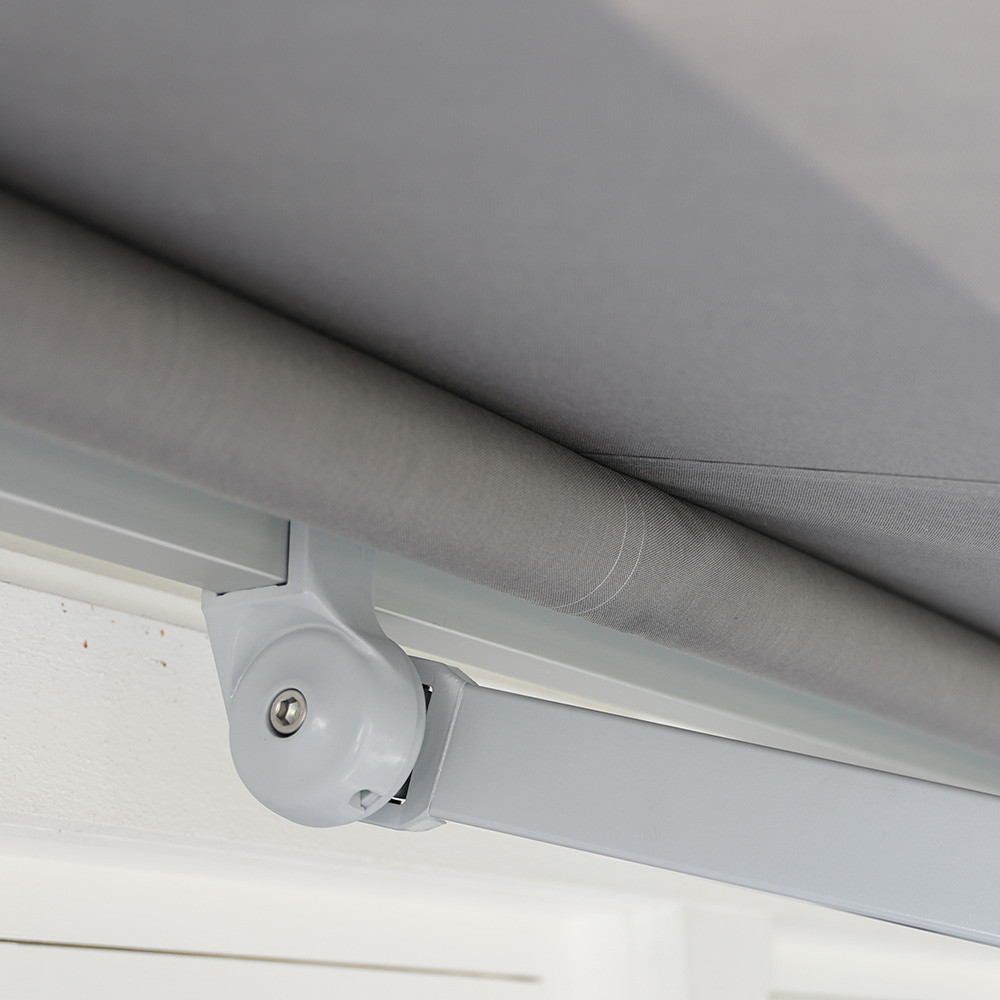 Beskyttelsestaket er i lakkert aluminium (RAL 9006) og monteres direkte på markisen.