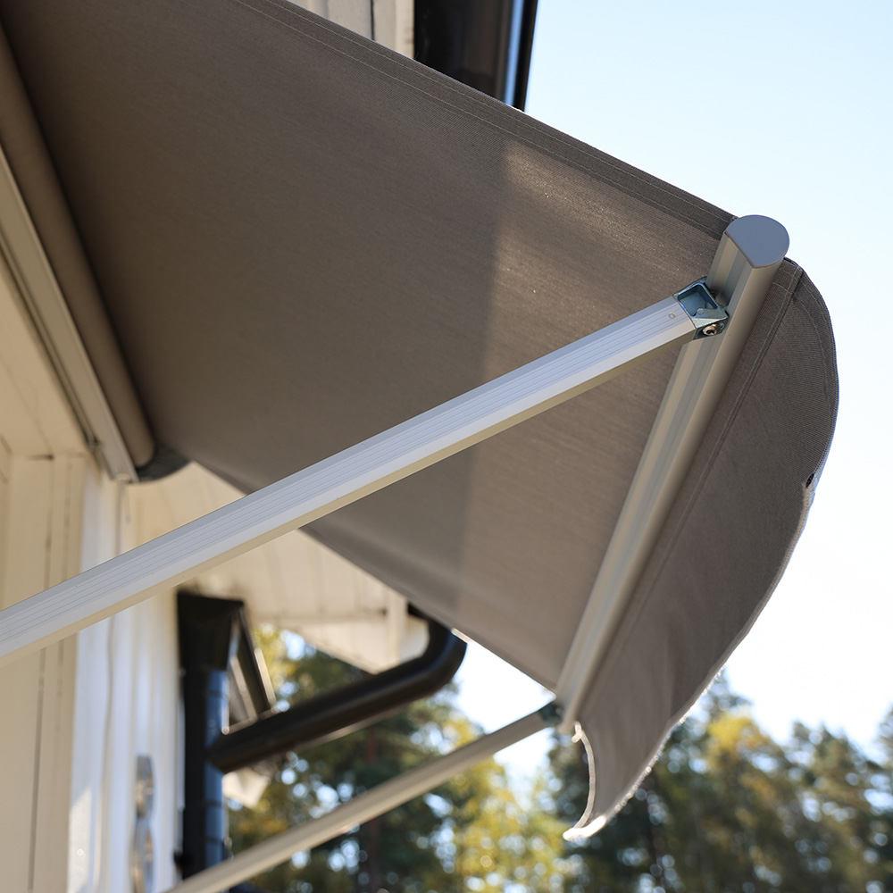 Du må installere markisen slik at stoffet er strekt ut og ikke utsettes for friksjon på noen måte. Et utspent stoff forhindrer at det dannes vannlommer ved regn. Under lett regn kan markisen være ute om den har en god fallvinkel, slik at vannet kan renne av.