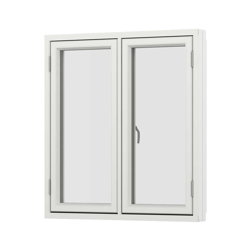 Vindu av treverk kledd utvendig med pulverlakkert aluminium. Lyssand Sidehengslet er et åpningsvindu som slår utover.